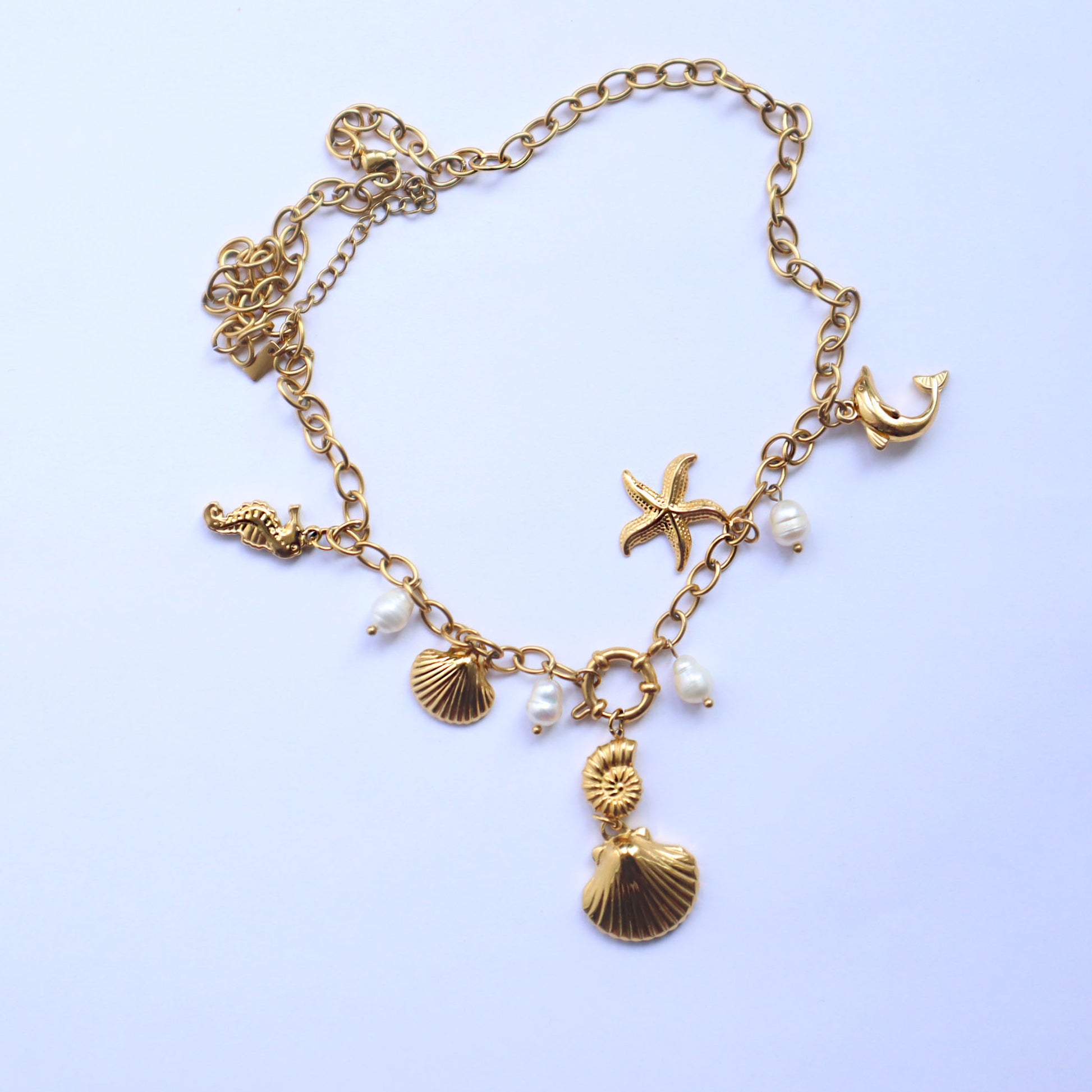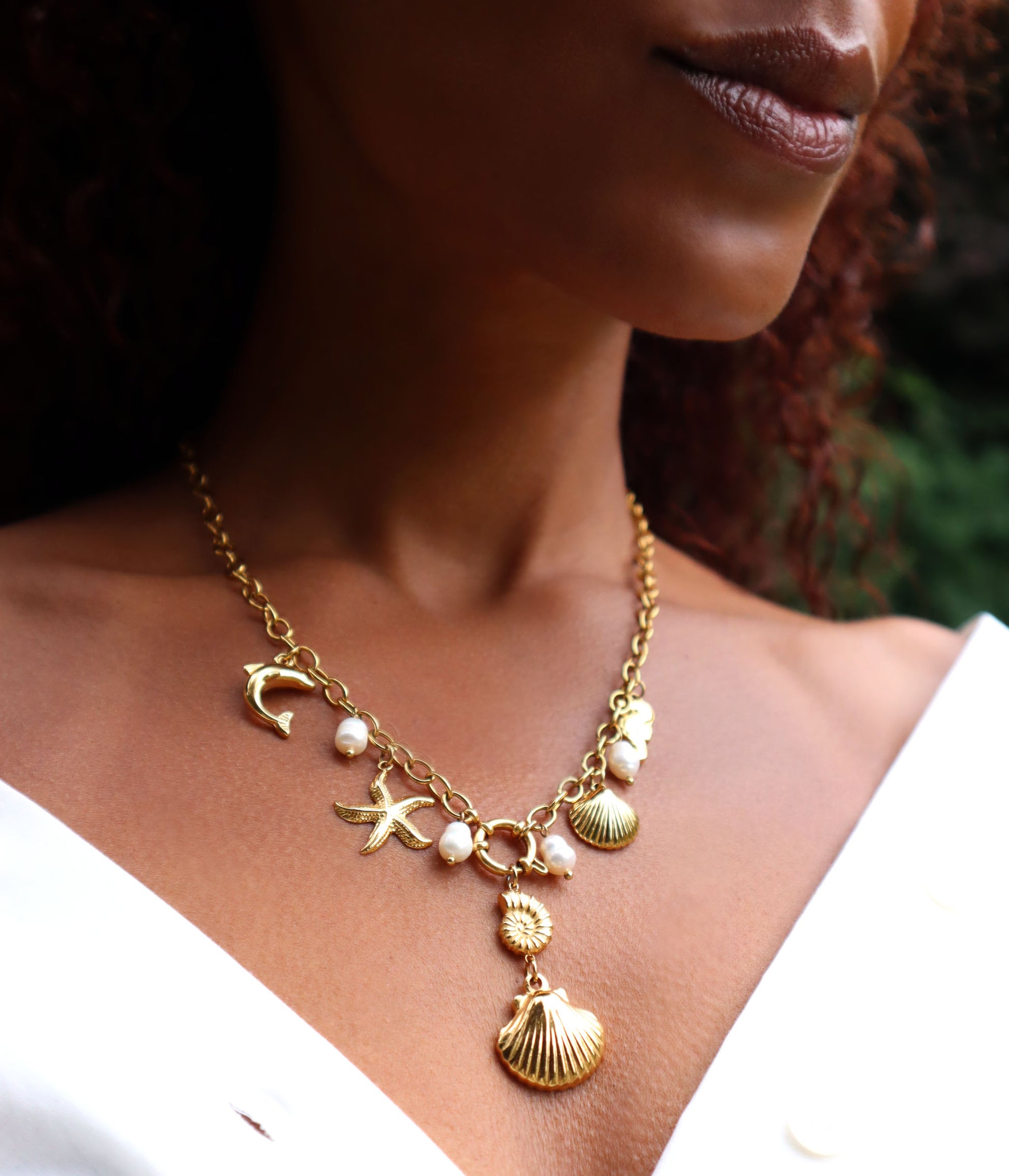 Bring the spirit of the sea to your everyday look with the Costa Charm Necklace. This gold-tone chain is adorned with ocean-inspired charms - think starfish, seashells, seahorses and delicate pearls. Each one evokes the magic of sun-drenched shores and salty air. Wear it solo or for a playful statement, or layer it with minimal chains for a dreamy, coastal stack.