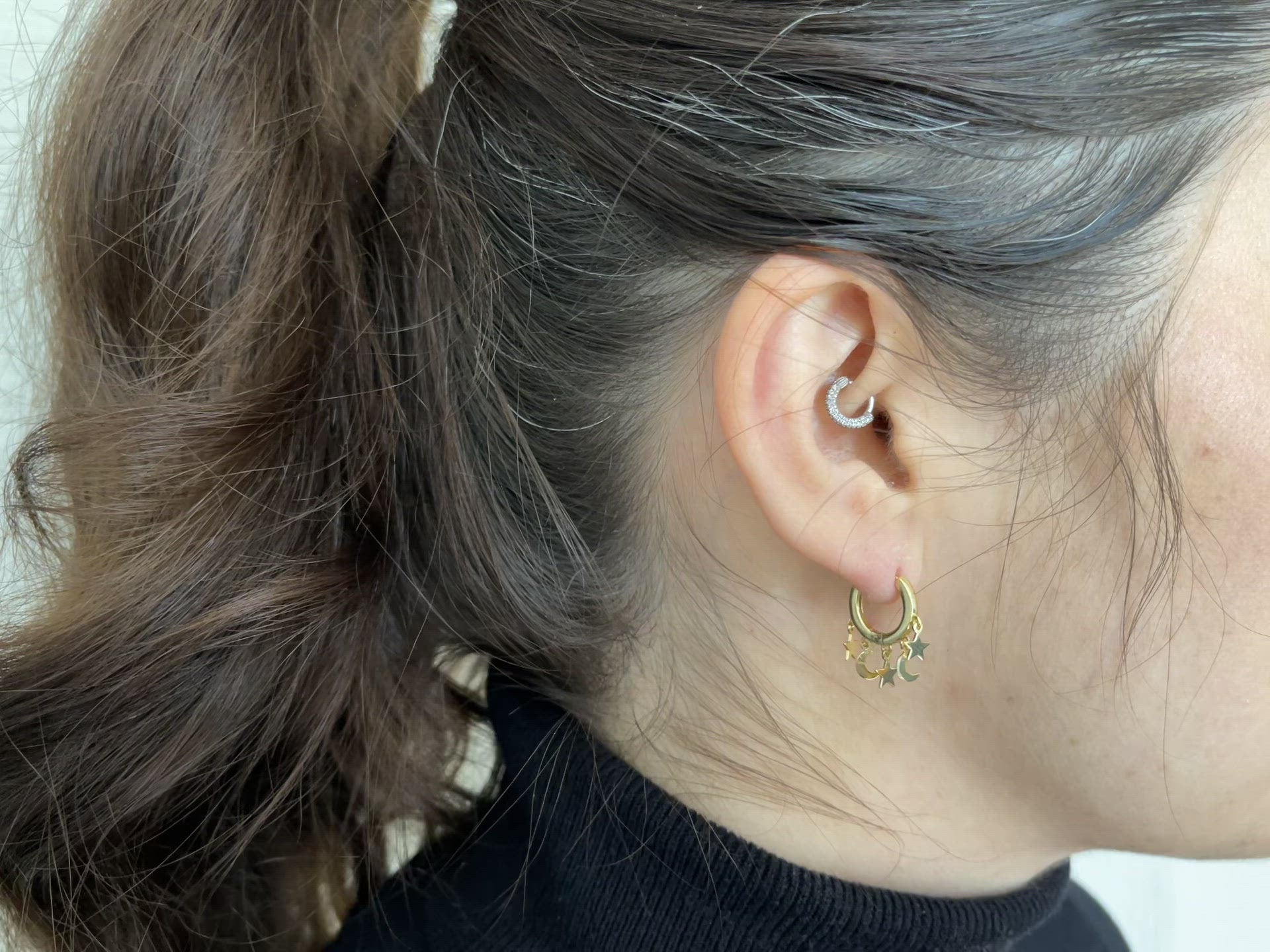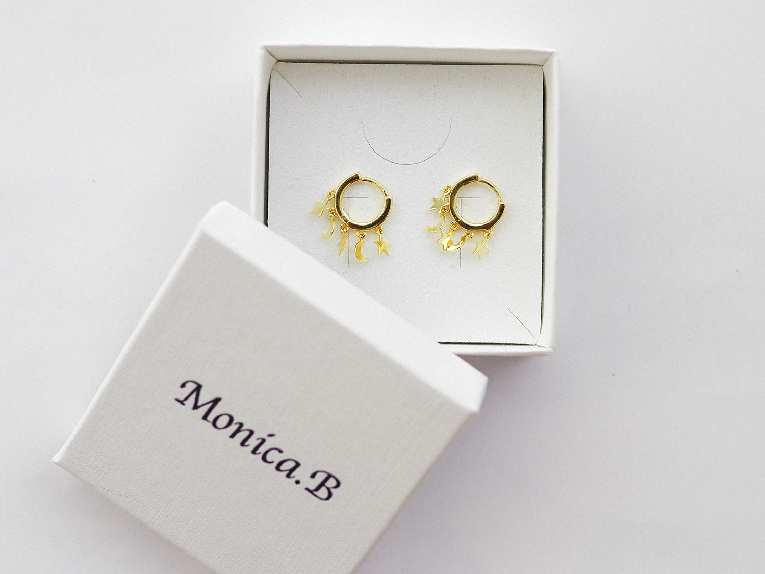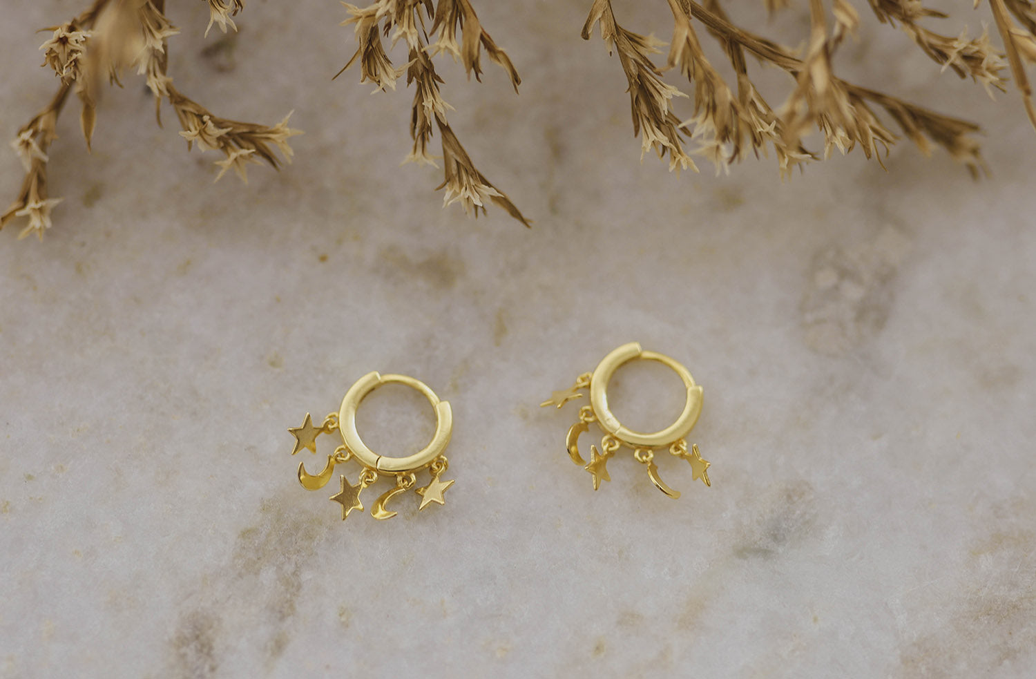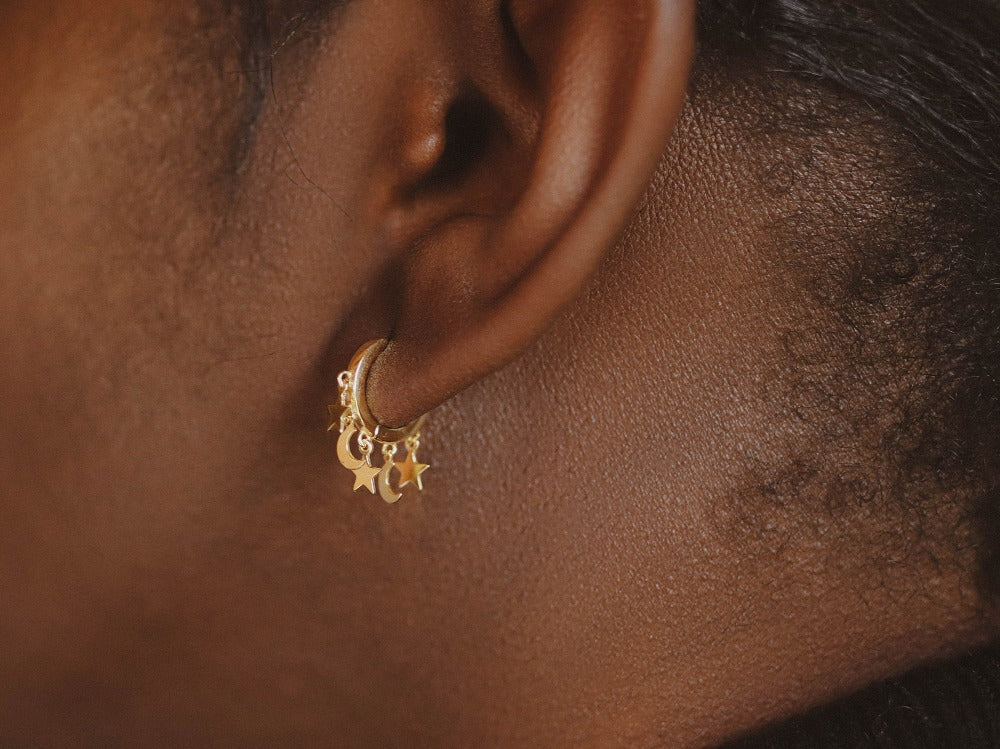 Simple huggies, with stars and crescent-moon charms. You can wear them in your first lobes solo, perfect for an everyday look. Or stack them with other earrings if you have additional piercings.