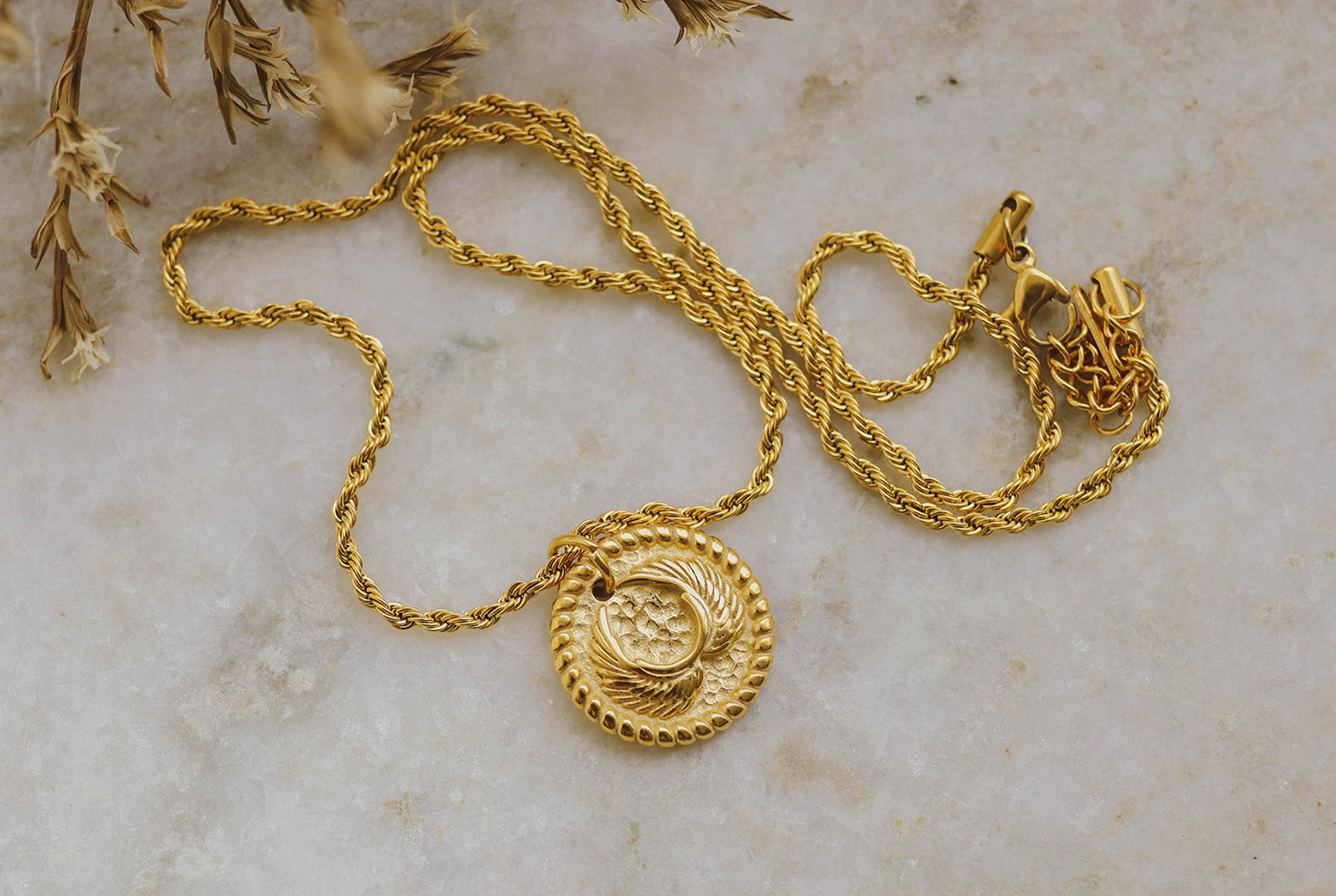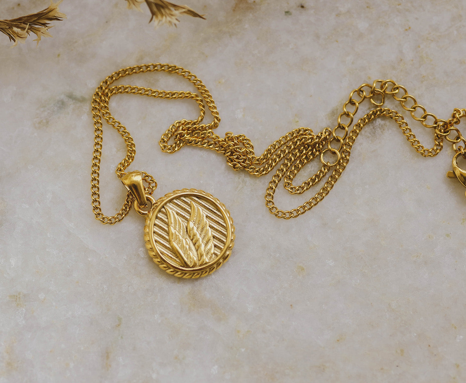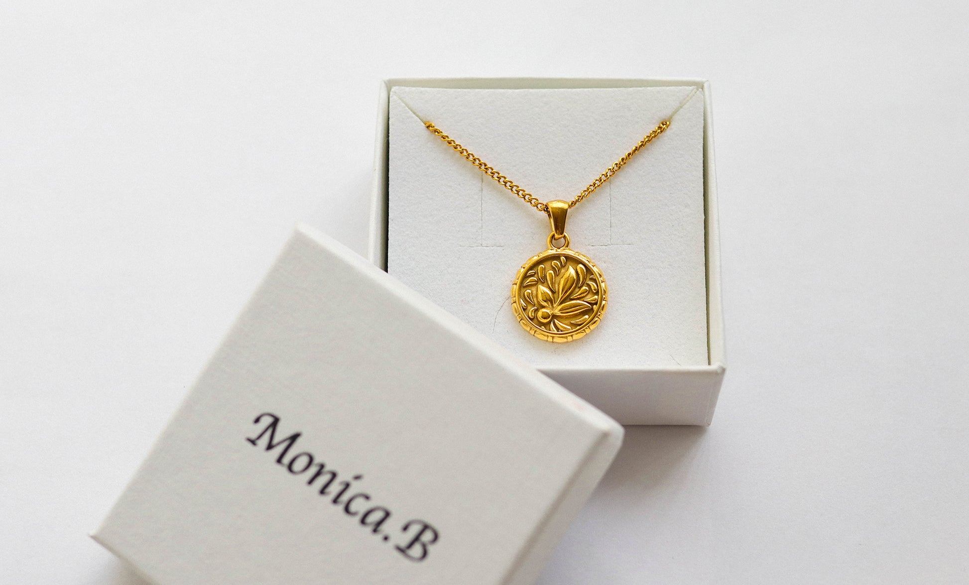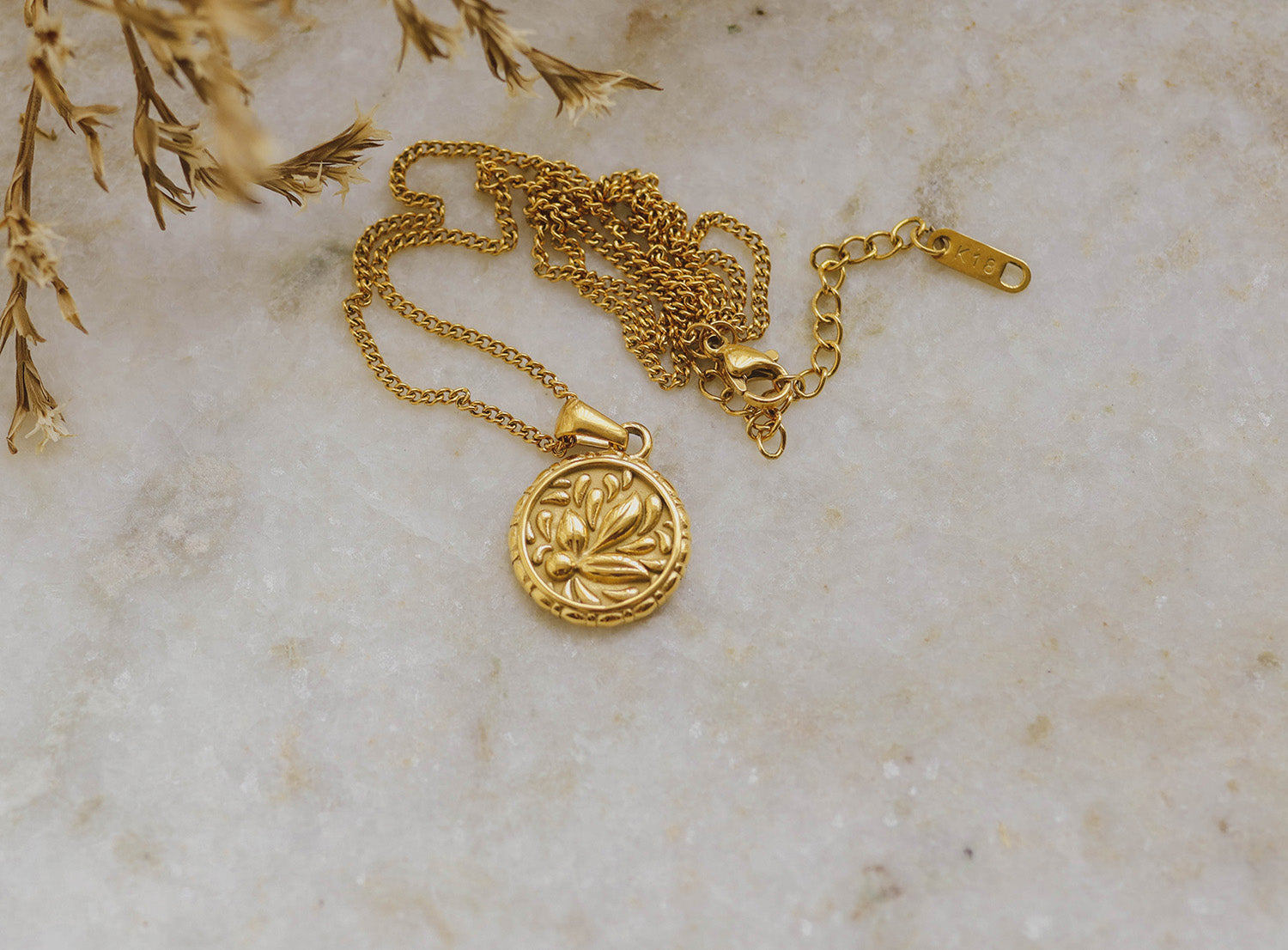 The Lotus Necklace is a collection of embossed pendant chains. Each pendant features a raised design on the surface. The design is created by pressing a pattern or image into the metal, creating a textured and three-dimensional effect. The Lotus Necklaces are stainless steel with 18 K Gold PVD coating. The embossed design varies from intricate floral motifs to geometric patterns or symbolic shapes, making each necklace a unique and eye-catching piece. These necklaces are sweatproof, waterproof and hypoallergenic, making them a great addition to your everyday jewellery collection.