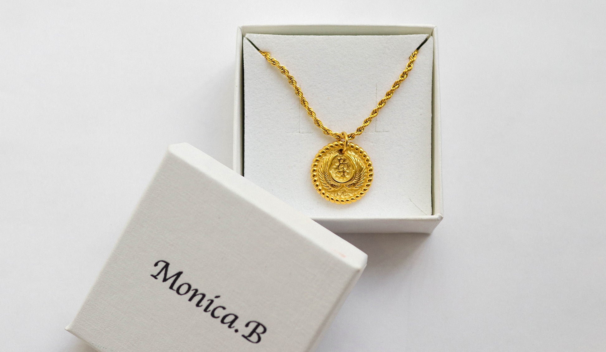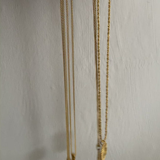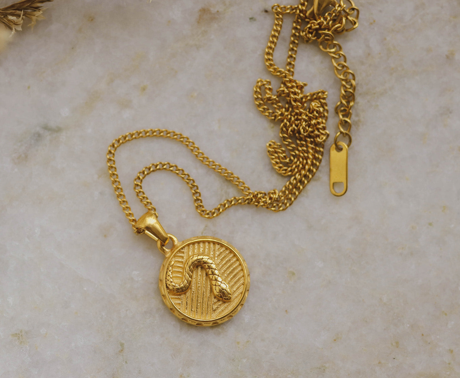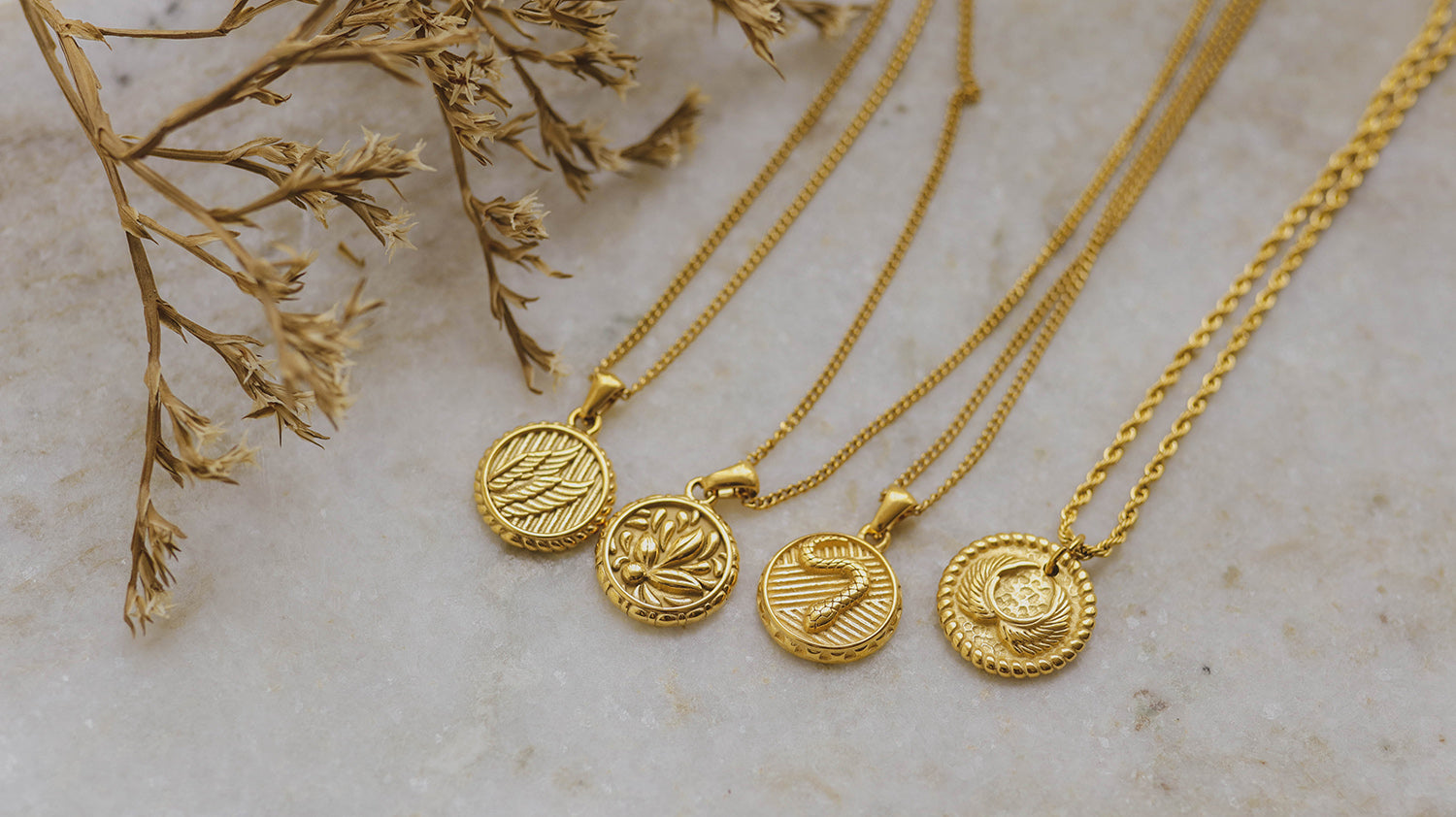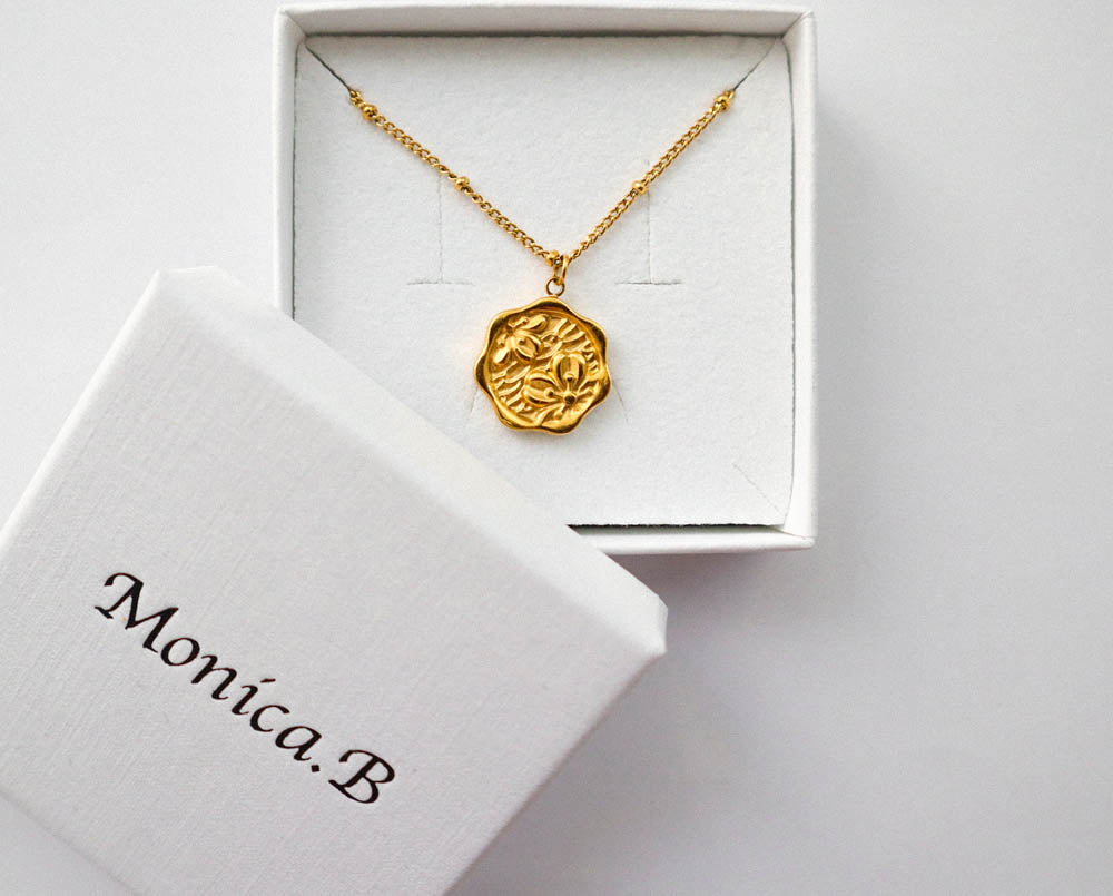 The Lotus Necklace is a collection of embossed pendant chains. Each pendant features a raised design on the surface. The design is created by pressing a pattern or image into the metal, creating a textured and three-dimensional effect. The Lotus Necklaces are stainless steel with 18 K Gold PVD coating. The embossed design varies from intricate floral motifs to geometric patterns or symbolic shapes, making each necklace a unique and eye-catching piece. These necklaces are sweatproof, waterproof and hypoallergenic, making them a great addition to your everyday jewellery collection.